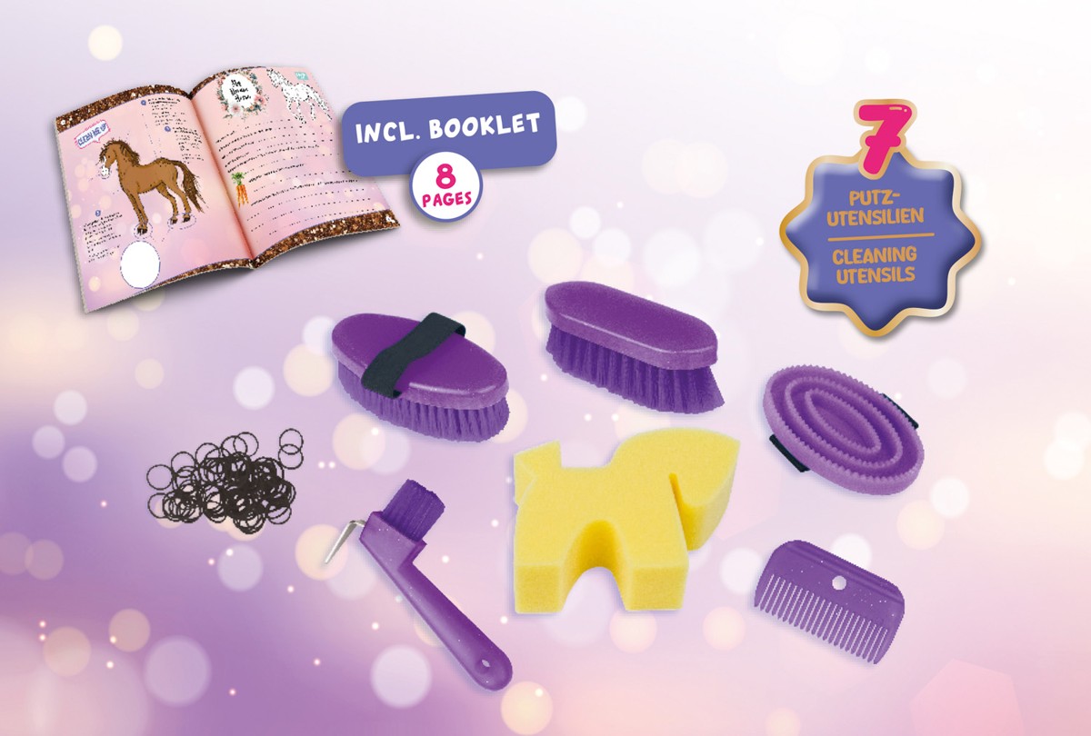Eine Pflegebox mit allem, was Sie brauchen: einem Hufkratzer, einem pferdeförmigen Schwamm, einem Mähnenkamm, einer Striegelbürste und zwei verschiedenen Bürsten.