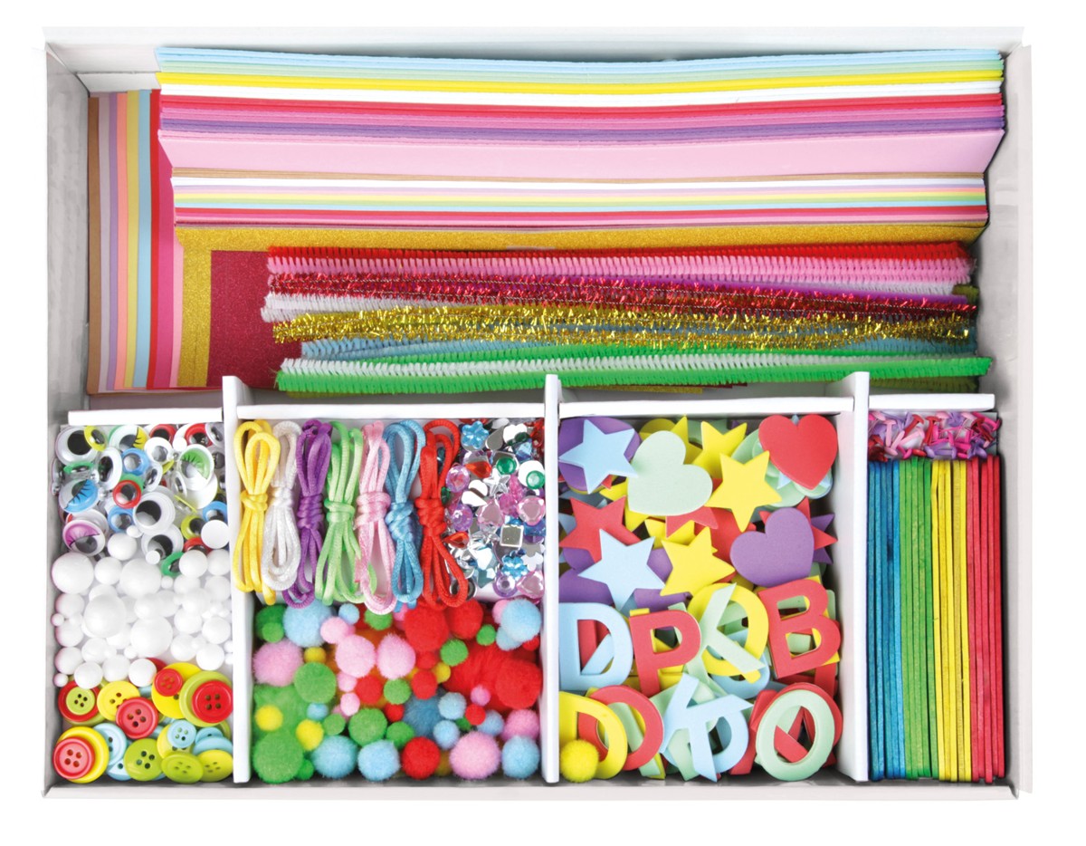 Der Koffer enthält farbiges Papier, Teile aus Schaumgummi, flauschige Stäbchen, Augen, Bommeln, bunte Eisstiele, Knöpfe und vieles mehr in den Farben Rosa und Violett. 400 Stück.