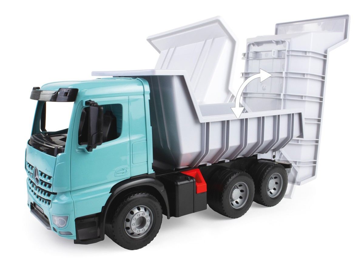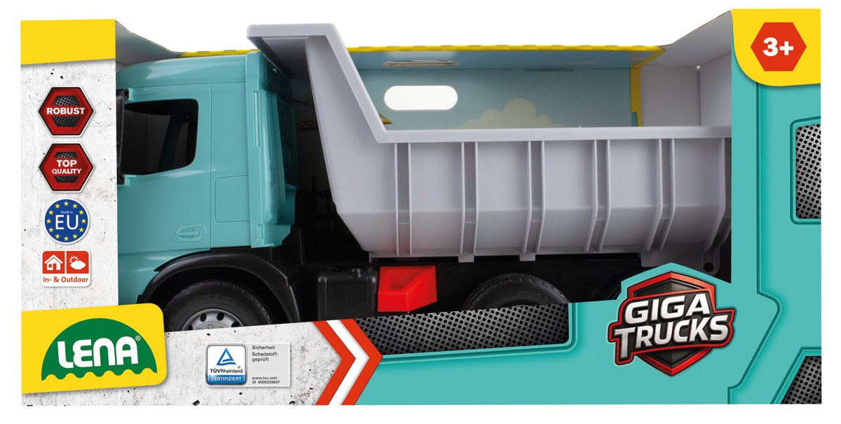 Plastic car with extended hull for carrying large and heavy loads. The body can be secured with a safety lock against unwanted tipping. Packed in decorative carton.